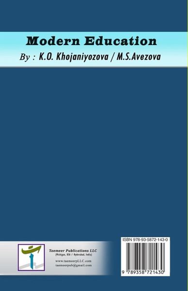 This book "Modern Education" is a collection of research articles by K.O. Khojaniyozova and M.S.Avezova, scholars from Uzbekistan. It contains few essays comprising the topics of concept and formation of modern education, Factors influencing the organization of the modern education system, Modern educational technologies, Modern educational organizations and their tasks etc.