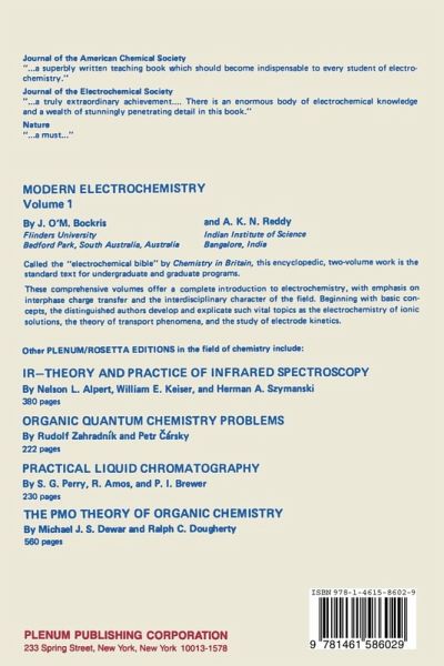This book had its nucleus in some lectures given by one of us (J. O'M. B. ) in a course on electrochemistry to students of energy conversion at the University of Pennsylvania. It was there that he met a number of people trained in chemistry, physics, biology, metallurgy, and materials science, all of whom wanted to know something about electrochemistry. The concept of writing a book about electrochemistry which could be understood by people with very varied backgrounds was thereby engendered. The lectures were recorded and written up by Dr. Klaus Muller as a 293-page manuscript. At a later stage, A. K. N. R. joined the effort; it was decided to make a fresh start and to write a much more comprehensive text. Of methods for direct energy conversion, the electrochemical one is the most advanced and seems the most likely to become of considerable practical importance. Thus, conversion to electrochemically powered trans portation systems appears to be an important step by means of which the difficulties of air pollution and the effects of an increasing concentration in the atmosphere of carbon dioxide may be met. Corrosion is recognized as having an electrochemical basis. The synthesis of nylon now contains an important electrochemical stage. Some central biological mechanisms have been shown to take place by means of electrochemical reactions. A number of American organizations have recently recommended greatly increased activity in training and research in electrochemistry at universities in the United States.