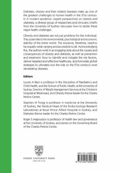 Diabetes, obesity and their related diseases make up one of the greatest challenges to human health in the 21st century. In A Modern Epidemic: Expert Perspectives on Obesity and Diabetes, a diverse group of researchers and clinicians from the University of Sydney has joined forces to discuss how to tackle these major health challenges. Obesity and diabetes are not just problems for the individual. They pose risks to the environmental, psychological and economic stability of the entire world. The solutions, therefore, need to be equally wide-ranging and accessible to all. Acknowledging this, the authors write in an engaging style about the causes and consequences of obesity and diabetes, as well as prevention and treatment: how to identify and mitigate the risk factors, deliver targeted and effective healthcare, and formulate global strategies to ultimately turn the tide on the 21st century's most devastating diseases.