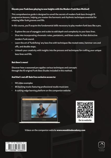 Unleash Your Funk Potential with the "Modern Funk Bass - The Method" Dive into the world of modern funk bass with the "Modern Funk Bass Method." This comprehensive book is a treasure trove of 15 progressive lessons and 10 Funk Etudes designed to elevate your funk bass playing to new heights. What you will find inside: 15 Progressive Lessons: Master the harmonic and rhythmic techniques crucial for crafting killer funk grooves. 110 Video Examples: Visualize each Example and Etude with online video support. 10 Funk Etudes: Apply your newfound skills with original studies that push your boundaries. 85 Backing Tracks: Practice with professional studio musicians and enhance your playing. Cutting-edge Learning Platform: Access a state-of-the-art learning experience on the companion website, www.woodshedacademy.com, for free! Unlock the secrets of using arpeggios and scales to add depth to your bass lines. Explore chromatic notes, pentatonic, and blues scales for a distinctive modern funk sound. Learn techniques like muted notes, hammer-ons, and double stops to 'funkify' any bass line. Unleash your creativity with insights into the process of crafting unique bass lines and fills. Elevate your Funk Bass Playing Today! Embark on a musical journey with the "Modern Funk Bass Method." Whether you're a beginner or an experienced player, this guide is your ticket to mastering the art of funk bass. Start your journey now and bring your funk potential to life!