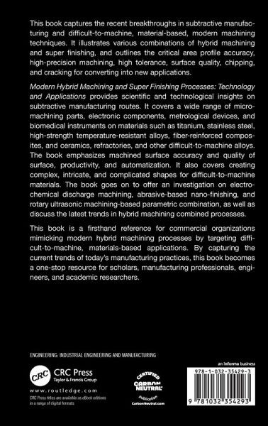 This book captures recent breakthroughs in subtractive manufacturing and difficult-to-machine material-based modern techniques including hybrid machining and super finishing and outlines the critical area profile accuracy, high precision machining, high tolerance, surface quality, chipping, and cracking, for converting into new applications.