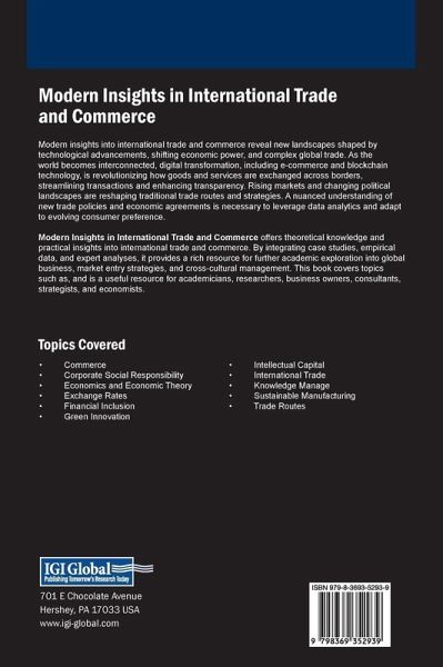 Modern insights into international trade and commerce reveal new landscapes shaped by technological advancements, shifting economic power, and complex global trade. As the world becomes interconnected, digital transformation, including e-commerce and blockchain technology, is revolutionizing how goods and services are exchanged across borders, streamlining transactions and enhancing transparency. Rising markets and changing political landscapes are reshaping traditional trade routes and strategies. A nuanced understanding of new trade policies and economic agreements is necessary to leverage data analytics and adapt to evolving consumer preference. Modern Insights in International Trade and Commerce offers theoretical knowledge and practical insights into international trade and commerce. By integrating case studies, empirical data, and expert analyses, it provides a rich resource for further academic exploration into global business, market entry strategies, and cross-cultural management. This book covers topics such as, and is a useful resource for academicians, researchers, business owners, consultants, strategists, and economists.