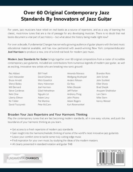 For years, jazz musicians have relied on real books as a source of repertoire, and as a way of learning the classic, must-know tunes that are a rite of passage for any developing musician. There is no doubt that real books document a vital part of jazz history - but what about the history being made right now? For over a decade, Fundamental Changes has served a growing audience of guitar players with the best music educational material available, and has now partnered with award-winning New York composer/educator Joel Harrison to produce a new, one-of-a-kind real book for modern jazz music. Modern Jazz Standards for Guitar brings together over 60 original compositions from a roster of incredible contemporary jazz guitarists. Included are contributions from numerous legends of modern jazz guitar, as well as exciting, innovative new artists who are breaking new sonic ground: Rez Abbasi David GilmoreWolfgang MuthspielJohn SchottCecil AlexanderMick GoodrickAnders NilssonJohn ScofieldSheryl BaileyMary HalvorsonOz NoyElliot SharpWill BernardJoel HarrisonMiles OkazakiBrad ShepikSteve CardenasGilad HekselmanJeff ParkerAnupam ShobhakarNels ClineNguyên LêAnthony PirogLeni SternLiberty Ellman Adam LevyJohn PisanoMike SternNir FelderPat MartinoAdam RogersKenny WesselDavid FiuczynskiPete McCannKurt RosenwinkelBill FrisellAmanda MonacoBrandon Ross Broaden Your Jazz Repertoire and Your Harmonic ThinkingPlay the contemporary tunes that are fast becoming modern standards, all in one easy volume, and push the boundaries of your harmonic thinking as you learn. Get access to a fresh repertoire of modern jazz standards Gain insight into the harmonic/melodic thinking of some of the world's most innovative jazz guitarists Leave your comfort zone to tackle some truly cutting-edge music Find inspiration for your own music by studying the ideas of the modern masters All clearly presented in standard notation and guitar TAB