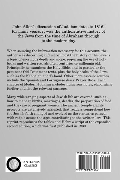 John Allen's discussion of Judaism dates to 1816; for many years, it was the authoritative history of the Jews from the time of Abraham through to the modern day. When sourcing the information necessary for this account, the author was discerning and meticulous: the history of the Jews is a topic of enormous depth and scope, requiring the use of holy books and written records often centuries or millennia old. Principally he examines the Holy Bible, and in particular the pertinent Old Testament texts, plus the holy books of the Jews such as the Kabbalah and Talmud. Other more esoteric sources include the Spanish and Portuguese Jews' Prayer Book. Each chapter of Modern Judaism includes numerous notes, elaborating further and list the relevant passages. Many wide-ranging aspects of Jewish life are covered; such as how to manage births, marriages, deaths, the preparation of food and the care of pregnant women. The ancient temple and its precepts are extensively narrated, that readers comprehend how the Jewish faith changed and evolved as the centuries passed, with rabbis across the ages contributing to the written lore. This reprint reproduces the tables and Hebrew script of the expanded second edition, which was first published in 1830.