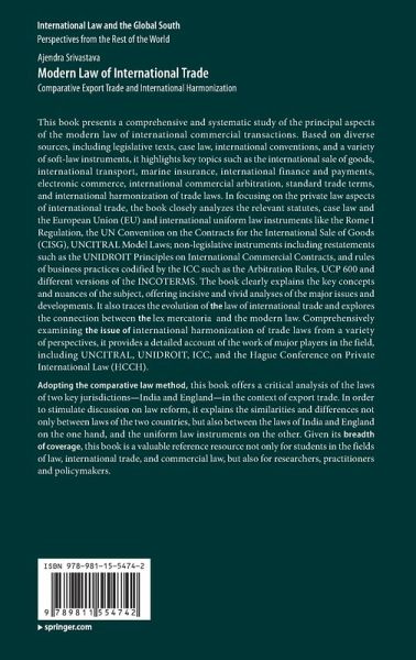 Adopting the comparative law method, this book offers a critical analysis of the laws of two key jurisdictions-India and England-in the context of export trade. In order to stimulate discussion on law reform, it explains the similarities and differences notonly between laws of the two countries, but also between the laws of India and England on the one hand, and the uniform law instruments on the other. Given its breadth of coverage, this book is a valuable reference resource not only for students in the fields of law, international trade, and commercial law, but also for researchers, practitioners and policymakers.