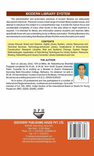 The administration and automation practices of modern libraries are elaborately discussed in this book. This book covers a wide range of modern library system issues, and attempt to introduce the subject in a comprehensive way. It avoids the narrow focus and considerable complexity of many other books in this area where in depth treatment is required. It is intended for library and information science students and teachers alike, specifically those who are undertaking study on library automation.