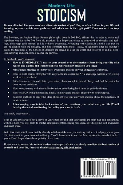 Do you often feel like your emotions often take control of you? Do you often feel lost in your life, not knowing anymore which your goals are and which one is the right path? Then you need to keep reading... The Stoicism, an Ancient Greco-Roman philosophy born in 300 B.C, affirms that in order to reach real happiness one has to be free from his emotions. It is important to not be controlled by thoughts and feelings, and accept each moment as it is with self-awareness. According to the Stoics, it's in this way that we can be aligned with the universe, and find complete fulfillment. Today, millenniums after its founder's death, the teachings of the School of Stoicism are spread all over the world and followed to end all needless suffering and connect to a deeper life purpose. In this book, you'll discover: How to IMMEDIATELY master your control over the emotions (Start living your life with reason and dignity and learn to not lose control in any situation you face!) Mindfulness practices to improve self-awareness and end all your unnecessary suffering. How to build mental strengths with easy tools and overcome ANY challenge without ever feeling weak or overwhelmed. Little-known secrets to declutter your mind, obtain complete mental clarity, and find the best solutions to your problems. How to stay strong with three effective tricks even during hard times or periods of stress. How to STOP living the past and finally set new goals and feel aligned with your purpose. Fourteen methods to apply the Stoic philosophy to your daily life and rise above the negativity of modern times. Life-changing ways to take back control of your emotions, your mind, and your life (You'll develop the art of manifesting the reality you want to live!) and much, much more... Even if you have always felt a slave of your emotions and that your habits are often bad and consuming, with this book you will learn to master emotional control, strong resilience, self-discipline, self-awareness and much more. With this book you'll immediately identify which mistakes are you making that aren't helping you in your life, that result in your constant suffering. You'll learn how to use the Marcus Aurelius mindset to free yourself and forget about the negativity of our time. If you want to access this ancient wisdom and expert advice, and finally manifest the best version of yourself and your life, then you should start reading this book today!
