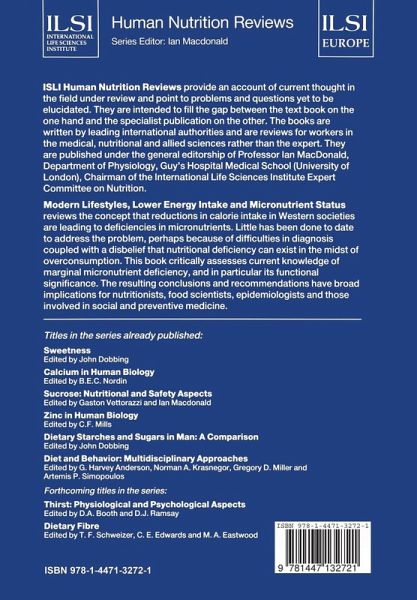 1. Effects of Lifestyle on Nutrient Requirements.- Lifestyle.- Lifestyle Components.- The Epidemiological Model.- Conclusion.- 2. Effects of Special Physiological Conditions on Micronutrient Status: Pregnancy, Lactation and Ageing.- Effect of Pregnancy and Lactation of Micronutrient Status.- Effect of Ageing on Micronutrient Status.- 3. Critical Appraisal of Current Approaches Towards Micronutrient Requirement.- The Analytical Logical Approach.- The Epidemiological Approach.- The Balance Approach.- The Pragmatic Approach.- Special Considerations.- Bioavailability.- The Concept of Relative Nutritional Density.- Summary.- 4. Identification of Those Micronutrients Most Likely To Be Insufficient as the Result of Habitual Low Energy Intake.- Materials and Methods.- Results.- Discussion.- Conclusion.- 5. Biochemical Markers for Micronutrient Status and Their Interpretation.- Vitamins.- Macroelements and Trace Elements.- Discussion.- 6. The Functional Significance of Marginal Micronutrient Deficiency.- Aetiology and Micronutrient Deficiency.- Functional Significance of Marginal Micronutrient Deficiencies.- Conclusion.- 7. The Functional Significance of Marginal Micronutrient Deficiency: Vitamin C.- 8. The Functional Significance of Marginal Micronutrient Status: Folate.- The Probability of Micronutrient Deficiency.- Sequence of Events in Folate Deficiency.- Haematological Findings in Marginal Folate Deficiency.- Biological Importance and Frequency of Marginal Folate Status.- Functional Significance of Marginal Folate Deficiency.- 9. Vitamin A Deficiencies and Latent Deficiencies.- Metabolism and Function of Vitamin A.- Diagnosis of Vitamin A Deficiency.- Vitamin A Deficiency.- Conclusion.- 10. Vitamin E: The Functional Significance of Suboptimal Plasma Levels.- Cancer.- Ischaemic Heart Disease (IHD).- Discussion of Prudent Doses.- Summary.- 11. Selenium and Modern Lifestyles.- 12. Calcium: The Functional Significance of Trends in Consumption.- Modern Trends in Calcium Intakes.- International Perspective of Calcium Intakes.- Calcium Deficiency.- Adaptation or Altered Requirements?.- Calcium RDAs and the Significance of Decreased Calcium Intakes.- 13. Magnesium: Clinical Forms of Primary Magnesium Deficiency.- The Neuromuscular Forms of MDI.- Other Clinical Forms of MDI.- Conclusion.- 14. The Functional Significance of Iron Deficiency.- The Main Iron Compounds in the Body and Their Function.- Iron Metabolism.- Effects of Iron Deficiency.- Thyroid Hormone Metabolism and Thermoregulation.- Concluding Comments.- 15. Zinc: The Functional Significance of Marginal Deficiency.- The Functions of Zinc.- Indices of Zinc Status.- Zinc in Food.- Experimental Restriction of Zinc Intake in Man.- Signs of Marginal Zinc Deficiency in Primates.- Indications of Marginal Zinc Deficiency in Man.- Adaptation to Low Zinc Intake.- Conclusions.- 16. Lowered Dietary Energy Consumption and Potential Consequences for Micronutrient Intake: An Overview.- Has There Really Been a Change in Total Food Intake?.- Are Data Devised from Food Intake Measurements of Misleading Accuracy?.- Can One Automatically Link Energy Intake to a Reduced Micronutrient Intake.- Practical Implications for the Immediate Future.- Metabolic Interactions between Nutrients.- The Diagnosis of Community Nutritional Status from Intake Data.- Conclusions.- Appendix 1: Report of the Vitamins Working Group.- Appendix 2: Report of the Minerals Working Group.