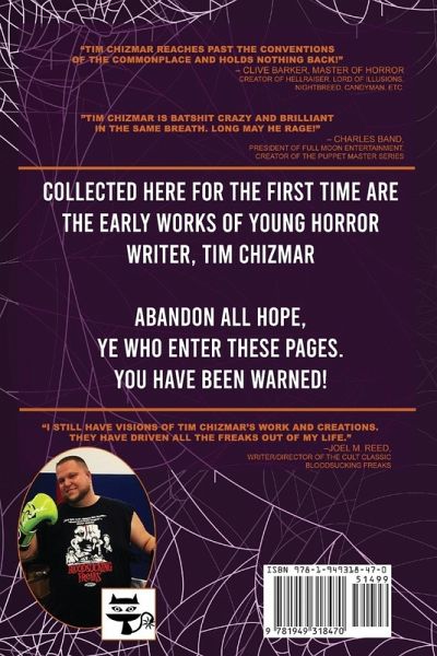 A collection of horror themed short stories and articles written by Tim Chizmar. This book features his early collected works. They range from the erotic to the gory; scary to the humorous. Over 11 featured stories including an article co-written by John Palisano, a screenplay, and an exclusive interview with horror master, Clive Barker. Tim drives you mad with his tantalizing and terrifying tales.