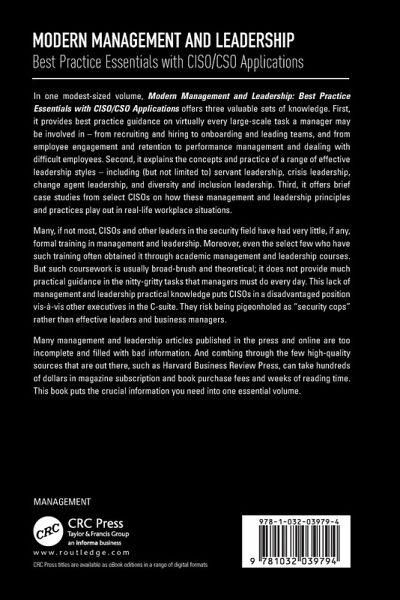 Second, it explains the essential concepts and practice of a range of effective leadership styles-including (but not limited to) servant leadership, crisis leadership, change agent leadership, and diversity and inclusion leadership. Third, it offers brief case studies from select CISOs and CSOs on how these management and leadership principles and practices play out in real-life workplace situations.