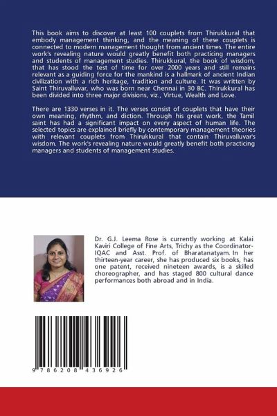 This book aims to discover at least 100 couplets from Thirukkural that embody management thinking, and the meaning of these couplets is connected to modern management thought from ancient times. The entire work's revealing nature would greatly benefit both practicing managers and students of management studies. Thirukkural, the book of wisdom, that has stood the test of time for over 2000 years and still remains relevant as a guiding force for the mankind is a hallmark of ancient Indian civilization with a rich heritage, tradition and culture. It was written by Saint Thiruvalluvar, who was born near Chennai in 30 BC. Thirukkural has been divided into three major divisions, viz., Virtue, Wealth and Love. There are 1330 verses in it. The verses consist of couplets that have their own meaning, rhythm, and diction. Through his great work, the Tamil saint has had a significant impact on every aspect of human life. The selected topics are explained briefly by contemporary management theories with relevant couplets from Thirukkural that contain Thiruvalluvar's wisdom. The work's revealing nature would greatly benefit both practicing managers and students of management studies.