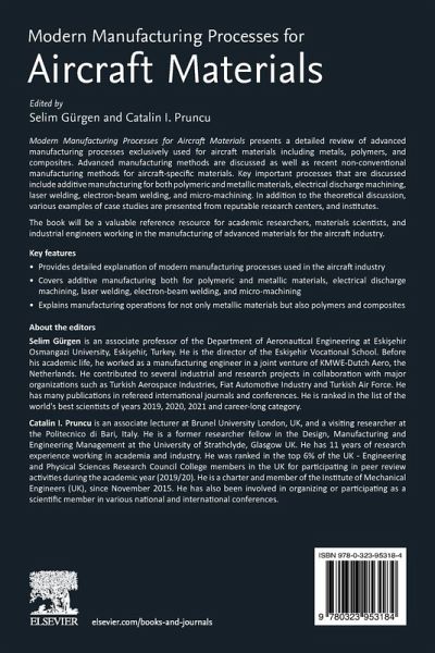 Modern Manufacturing Processes for Aircraft Materials presents a detailed review of advanced manufacturing processes exclusively used for aircraft materials, including metals, polymers and composites. Advanced manufacturing methods are discussed as well as recent non-conventional manufacturing methods for aircraft-specific materials. Key important processes discussed include additive manufacturing for both polymeric and metallic materials, electrical discharge machining, laser welding, electron beam welding, and micro-machining. In addition to the theoretical discussion, various examples of case studies are presented from reputable research centers, and institutes. This will be a valuable reference resource for academic researchers, materials scientists, and industrial engineers working in manufacturing of advanced materials for the aircraft industry.
