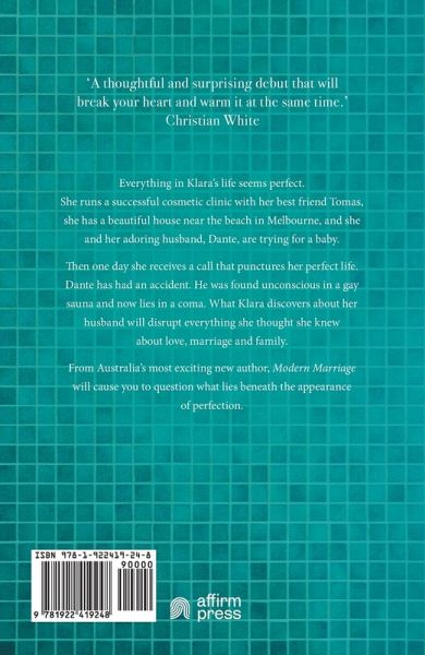 Everything in Klara's life seems perfect. She runs a successful cosmetic clinic with her best friend Tomas, she has a beautiful house near the beach in Melbourne, and she and her adoring husband Dante are trying for a baby. Then one day she receives a call that punctures her perfect life. Dante has had an accident. He was found unconscious in a gay sauna and now lies in a coma. What Klara discovers about her husband will disrupt everything she thought she knew about love, marriage and family. From Australia's most exciting new author, Modern Marriage will cause you to question what lies beneath the appearance of perfection.