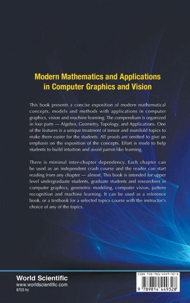 This book presents a concise exposition of modern mathematical concepts, models and methods with applications in computer graphics, vision and machine learning. The compendium is organized in four parts — Algebra, Geometry, Topology, and Applications. One of the features is a unique treatment of tensor and manifold topics to make them easier for the students. All proofs are omitted to give an emphasis on the exposition of the concepts. Effort is made to help students to build intuition and avoid parrot-like learning. There is minimal inter-chapter dependency. Each chapter can be used as an independent crash course and the reader can start reading from any chapter — almost. This book is intended for upper level undergraduate students, graduate students and researchers in computer graphics, geometric modeling, computer vision, pattern recognition and machine learning. It can be used as a reference book, or a textbook for a selected topics course with the instructor's choice of any of the topics.