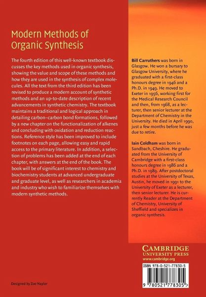 The fourth edition of this well-known textbook discusses the key methods used in organic synthesis, showing the value and scope of these methods and how they are used in the synthesis of complex molecules. All the text from the third edition has been revised, to produce a modern account of traditional methods and an up-to-date description of recent advancements in synthetic chemistry since the previous edition. A new chapter on the functionalisation of alkenes has been included and greater emphasis on highly stereoselective reactions and radical chemistry has been placed. Reference style has been improved to include footnotes on each page, allowing easy and rapid access to the primary literature. The book will be of significant interest to chemistry and biochemistry students at advanced undergraduate and graduate level, as well as researchers in academia and industry who wish to familiarise themselves with modern synthetic methods.