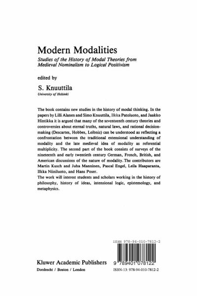 The word "modem" in the title of this book refers primarily to post-medieval discussions, but it also hints at those medieval mo dal theories which were considered modem in contradistinction to ancient conceptions and which in different ways influenced philosophical discussions during the early modem period. The me dieval developments are investigated in the opening paper, 'The Foundations of Modality and Conceivability in Descartes and His Predecessors', by Lilli Alanen and Simo Knuuttila. Boethius's works from the early sixth century belonged to the sources from which early medieval thinkers obtained their knowledge of ancient thought. They offered extensive discus sions of traditional modal conceptions the basic forms of which were: (1) the paradigm of possibility as a potency striving to realize itself; (2) the "statistical" interpretation of modal no tions where necessity means actuality in all relevant cases or omnitemporal actuality, possibility means actuality in some relevant cases or sometimes, and impossibility means omnitemporal non-actuality; and (3) the "logical" definition of possibility as something which, being assumed, results in nothing contradic tory. Boethius accepted the Aristotelian view according to which total possibilities in the first sense must prove their met tle through actualization and possibilities in the third sense are assumed to be realized in our actual history. On these presump tions, all of the above-mentioned ancient paradigms imply the Principle of Plenitude according to which no genuine possibility remains unrealized.