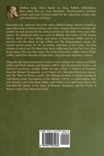 Andrew Lang, (born March 31, 1844, Selkirk, Selkirkshire, Scot.-died July 20, 1912, Banchory, Aberdeenshire), Scottish scholar and man of letters noted for his collections of fairy tales and translations of Homer. Educated at St. Andrews University and at Balliol College, Oxford, he held an open fellowship at Merton College until 1875, when he moved to London. He quickly became famous for his critical articles in The Daily News and other papers. He displayed talent as a poet in Ballads and Lyrics of Old France (1872), Helen of Troy (1882), and Grass of Parnassus (1888) and as a novelist with The Mark of Cain (1886) and The Disentanglers (1902). He earned special praise for his 12-volume collection of fairy tales, the first volume of which was The Blue Fairy Book (1889) and the last The Lilac Fairy Book (1910). His own fairy tales, The Gold of Fairnilee (1888), Prince Prigio (1889), and Prince Ricardo of Pantouflia (1893) became children's classics. Lang also did important pioneer work in such volumes as Custom and Myth (1884) and Myth, Ritual and Religion (1887). Later he turned to history and historical mysteries, notably Pickle the Spy (1897), A History of Scotland from the Roman Occupation, 4 vol. (1900-07), Historical Mysteries (1904), and The Maid of France (1908). His lifelong devotion to Homer produced well-known prose translations of the Odyssey (1879), in collaboration with S.H. Butcher, and of the Iliad (1883), with Walter Leaf and Ernest Myers. He defended the theory of the unity of Homeric literature, and his World of Homer (1910) is an important study. (wikipedia.org)