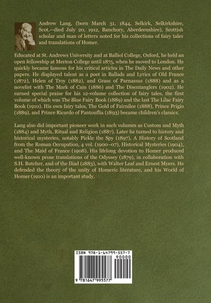 Andrew Lang, (born March 31, 1844, Selkirk, Selkirkshire, Scot.--died July 20, 1912, Banchory, Aberdeenshire), Scottish scholar and man of letters noted for his collections of fairy tales and translations of Homer. Educated at St. Andrews University and at Balliol College, Oxford, he held an open fellowship at Merton College until 1875, when he moved to London. He quickly became famous for his critical articles in The Daily News and other papers. He displayed talent as a poet in Ballads and Lyrics of Old France (1872), Helen of Troy (1882), and Grass of Parnassus (1888) and as a novelist with The Mark of Cain (1886) and The Disentanglers (1902). He earned special praise for his 12-volume collection of fairy tales, the first volume of which was The Blue Fairy Book (1889) and the last The Lilac Fairy Book (1910). His own fairy tales, The Gold of Fairnilee (1888), Prince Prigio (1889), and Prince Ricardo of Pantouflia (1893) became children's classics. Lang also did important pioneer work in such volumes as Custom and Myth (1884) and Myth, Ritual and Religion (1887). Later he turned to history and historical mysteries, notably Pickle the Spy (1897), A History of Scotland from the Roman Occupation, 4 vol. (1900-07), Historical Mysteries (1904), and The Maid of France (1908). His lifelong devotion to Homer produced well-known prose translations of the Odyssey (1879), in collaboration with S.H. Butcher, and of the Iliad (1883), with Walter Leaf and Ernest Myers. He defended the theory of the unity of Homeric literature, and his World of Homer (1910) is an important study. (wikipedia.org)