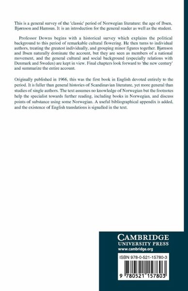 This general survey of the 'classic' period of Norwegian literature provides an introduction for the general reader as well as the student. Professor Downs begins with a historical survey which explains the political background to this period of flowering. He then turns to the individual authors, treating the greatest individually, and grouping minor figures together. Bjørnson and Ibsen naturally dominate the account, but they are seen as members of a national movement, and the general cultural and social background are kept in view. Final chapters look forward to 'the new century'. Originally published in 1966, this was the first book in English devoted entirely to the period. It is fuller than general histories of Scandinavian literature, yet more general than studies of single authors. The text assumes no knowledge of Norwegian but the footnotes help the specialist towards further reading, and discuss points of substance using some Norwegian.