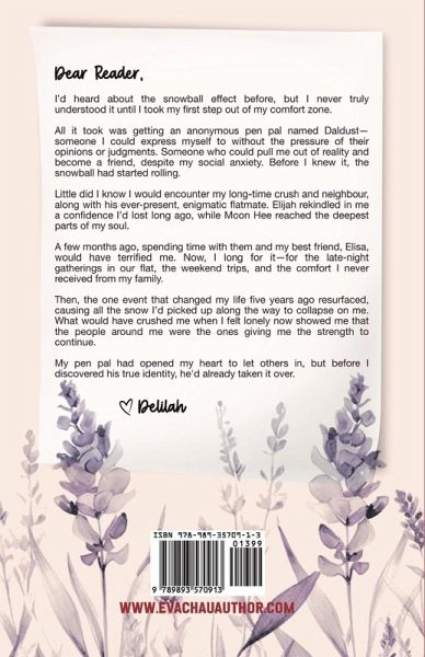 I'd heard about the snowball effect before, but I never truly understood it until I took my first step out of my comfort zone. All it took was getting an anonymous pen pal named Daldust-someone I could express myself to without the pressure of their opinions or judgments. Someone who could pull me out of reality and become a friend, despite my social anxiety. Before I knew it, the snowball had started rolling. Little did I know I would encounter my long-time crush and neighbour, along with his ever-present, enigmatic flatmate. Elijah rekindled in me a confidence I'd lost long ago, while Moon Hee reached the deepest parts of my soul. A few months ago, spending time with them and my best friend, Elisa, would have terrified me. Now, I long for it-for the late-night gatherings in our flat, the weekend trips, and the comfort I never received from my family. Then, the one event that changed my life five years ago resurfaced, causing all the snow I'd picked up along the way to collapse on me. What would have crushed me when I felt lonely now showed me that the people around me were the ones giving me the strength to continue. My pen pal had opened my heart to let others in, but before I discovered his true identity, he'd already taken it over. Modern Pen Pals is a contemporary romance with strangers-to-friends-to-lovers, love triangle, found family, pen pals, mental health representation, open-door spice, and multicultural romance (British x Korean) tropes.