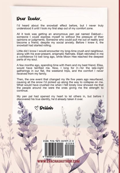 I'd heard about the snowball effect before, but I never truly understood it until I took my first step out of my comfort zone. All it took was getting an anonymous pen pal named Daldust-someone I could express myself to without the pressure of their opinions or judgments. Someone who could pull me out of reality and become a friend, despite my social anxiety. Before I knew it, the snowball had started rolling. Little did I know I would encounter my long-time crush and neighbour, along with his ever-present, enigmatic flatmate. Elijah rekindled in me a confidence I'd lost long ago, while Moon Hee reached the deepest parts of my soul. A few months ago, spending time with them and my best friend, Elisa, would have terrified me. Now, I long for it-for the late-night gatherings in our flat, the weekend trips, and the comfort I never received from my family. Then, the one event that changed my life five years ago resurfaced, causing all the snow I'd picked up along the way to collapse on me. What would have crushed me when I felt lonely now showed me that the people around me were the ones giving me the strength to continue. My pen pal had opened my heart to let others in, but before I discovered his true identity, he'd already taken it over. Modern Pen Pals is a contemporary romance with strangers-to-friends-to-lovers, love triangle, found family, pen pals, mental health representation, open-door spice, and multicultural romance (British x Korean) tropes.