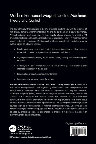 Modern Permanent Magnet Electric Machines: Theory and Control serves as a textbook for undergraduate power engineering students who want to supplement and expand their knowledge in the fundamentals of magnetism, soft magnetic materials, permanent magnets (PMs), calculation of magnetic circuits with PMs, modern PM brushed DC machines and their controls, modern PM brushless DC motors and drive control, and modern PM generators. The book can help students learn more about electrical machines and can serve as a prescribed text for teaching elective undergraduate courses such as modern permanent magnet electrical machines. Since the book is written in a simple scientific language and without redundant mathematics, it can also be used by practicing engineers and managers employed in electrical machinery or electromagnetic device industries.