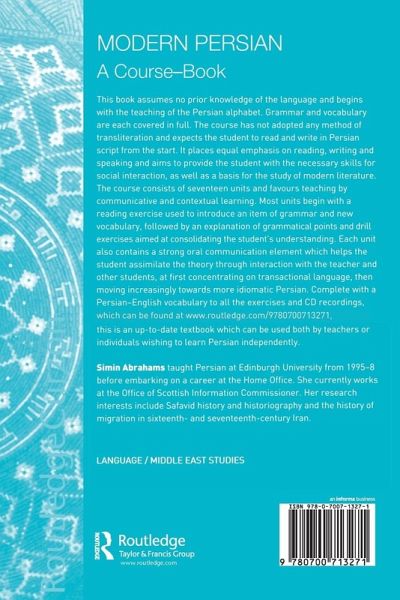 Modern Persian begins with the teaching of the Persian alphabet. It aims to provide the student with the necessary skills for social interaction, as well as a basis for the study of modern literature. The course consists of seventeen units and favours teaching by communicative and contextual learning. Most units begin with a reading exercise used to introduce an item of grammar and new vocabulary, followed by explanations and drill exercises aimed at consolidating the student's understanding. Complete with Persian-English vocabulary to all the exercises and tape recordings, this is an up-to-date textbook which can be used both by teachers or individuals wishing to learn Persian independently.