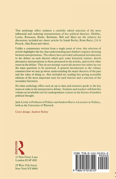 This anthology offers students a carefully edited selection of the most influential and enduring interpretations of key political theorists. There are sections on Hobbes, Locke, Rousseau, Burke, Bentham, Mill and Marx. Each section includes classic articles by leading critics, a substantial introduction by the editors, and a guide to further reading. A general introduction to the volume as a whole is also provided. This is an up-to-date and extensive guide to the key issues at stake in the interpretative debate, and it provides an invaluable text for students and teachers of modern political thought.