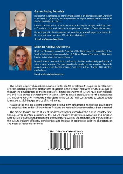 The culture industry should become attractive for capital investment through the development of organizational-economic mechanisms of support in the form of integrated structures as well as through the development of mechanisms of its financing: systems of culture multichannel backing and state-private partnership which would allow to create prerequisites for the appearance and implementation of new ideas and projects in the culture field, contributing to culture sphere formation as a full-fledged source of state income. As a result of this project implementation, original new fundamental theoretical assumptions and empirical data in the culture industry field and the regional development have been obtained. The project focuses on the study of fundamental basics research of the culture industry functioning, solves scientific problems of the culture industry effectiveness evaluation and direction justification of its support and funding; there are being worked out strategies and mechanisms of the culture industry efficiency development and increase in accordance with the characteristics and needs of regional economies.