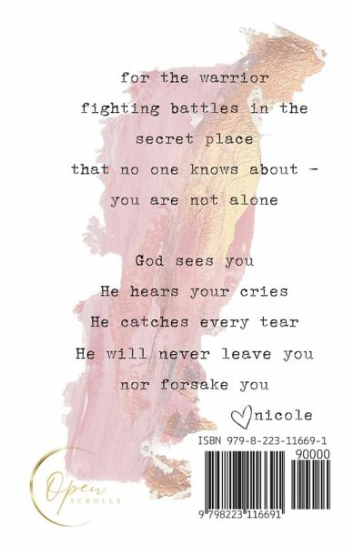 This book is for the warrior, fighting battles in the secret place that no one knows about. You may have been rejected, abandoned, betrayed. You may have been let down, kicked around, used or abused. But know this: you are not alone. God sees you. He hears your cries. He catches every tear. He will never leave you, nor forsake you. In the depths of pain - In the depths of heartache - In the midst of turmoil - Run to Him When the storm clouds darken the sky And the winds blow And the waves crash Look to Him Run to Him Cling to Him He will bring you thru - He is the Truth The Way The Life His plans for you are good - Keep fighting, fighter He is Worthy & He is worth it
