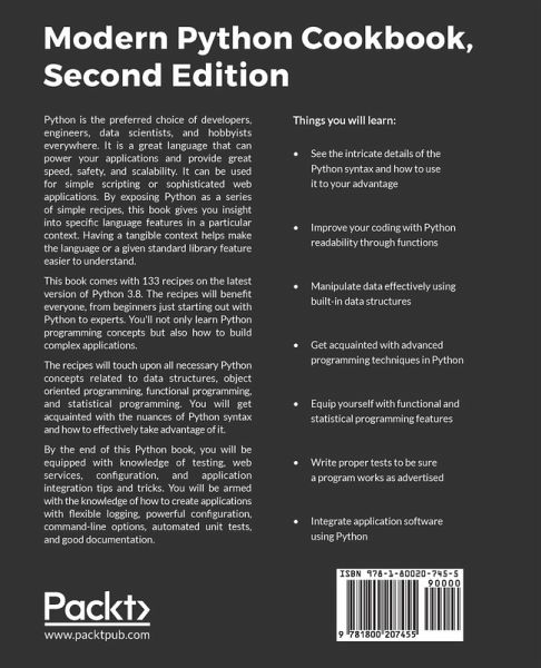 Complete recipes spread across 15 chapters to help you overcome commonly faced issues by Python for everybody across the globe. Each recipe takes a problem-solution approach to resolve for effective Python. Key Features - Develop expressive and effective Python programs - Best practices and common idioms through carefully explained recipes - Discover new ways to apply Python for data-focused development - Make use of Python's optional type annotations Book Description Python is the preferred choice of developers, engineers, data scientists, and hobbyists everywhere. It is a great language that can power your applications and provide great speed, safety, and scalability. It can be used for simple scripting or sophisticated web applications. By exposing Python as a series of simple recipes, this book gives you insight into specific language features in a particular context. Having a tangible context helps make the language or a given standard library feature easier to understand. This book comes with 133 recipes on the latest version of Python 3.8. The recipes will benefit everyone, from beginners just starting out with Python to experts. You'll not only learn Python programming concepts but also how to build complex applications. The recipes will touch upon all necessary Python concepts related to data structures, object oriented programming, functional programming, and statistical programming. You will get acquainted with the nuances of Python syntax and how to effectively take advantage of it. By the end of this Python book, you will be equipped with knowledge of testing, web services, configuration, and application integration tips and tricks. You will be armed with the knowledge of how to create applications with flexible logging, powerful configuration, command-line options, automated unit tests, and good documentation. What you will learn - See the intricate details of the Python syntax and how to use it to your advantage - Improve your coding with Python readability through functions - Manipulate data effectively using built-in data structures - Get acquainted with advanced programming techniques in Python - Equip yourself with functional and statistical programming features - Write proper tests to be sure a program works as advertised - Integrate application software using Python Who this book is for The Python book is for web developers, programmers, enterprise programmers, engineers, and big data scientists. If you are a beginner, this book will get you started. If you are experienced, it will expand your knowledge base. A basic knowledge of programming would help. Table of Contents - Numbers, Strings, and Tuples - Statements and Syntax - Function Definitions - Built-In Data Structures Part 1: Lists and Sets - Built-In Data Structures Part 2: Dictionaries - User Inputs and Outputs - Basics of Classes and Objects - More Advanced Class Design - Functional Programming Features - Input/Output, Physical Format, and Logical Layout - Testing - Web Services - Application Integration: Configuration - Application Integration: Combination - Statistical Programming and Linear Regression