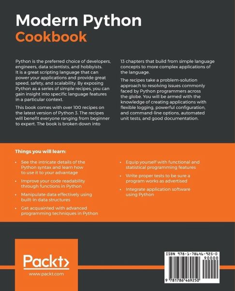 The latest in modern Python recipes for the busy modern programmer Key Features:Develop succinct, expressive programs in Python Learn the best practices and common idioms through carefully explained and structured recipes Discover new ways to apply Python for the new age of development Book Description: Python is the preferred choice of developers, engineers, data scientists, and hobbyists everywhere. It is a great scripting language that can power your applications and provide great speed, safety, and scalability. By exposing Python as a series of simple recipes, you can gain insight into specific language features in a particular context. Having a tangible context helps make the language or standard library feature easier to understand. This book comes with over 100 recipes on the latest version of Python. The recipes will benefit everyone ranging from beginner to an expert. The book is broken down into 13 chapters that build from simple language concepts to more complex applications of the language. The recipes will touch upon all the necessary Python concepts related to data structures, OOP, functional programming, as well as statistical programming. You will get acquainted with the nuances of Python syntax and how to effectively use the advantages that it offers. You will end the book equipped with the knowledge of testing, web services, and configuration and application integration tips and tricks. The recipes take a problem-solution approach to resolve issues commonly faced by Python programmers across the globe. You will be armed with the knowledge of creating applications with flexible logging, powerful configuration, and command-line options, automated unit tests, and good documentation. What you will learn:See the intricate details of the Python syntax and how to use it to your advantage Improve your code readability through functions in Python Manipulate data effectively using built-in data structures Get acquainted with advanced programming techniques in Python Equip yourself with functional and statistical programming features Write proper tests to be sure a program works as advertised Integrate application software using Python Who this book is for: The book is for web developers, programmers, enterprise programmers, engineers, big data scientist, and so on. If you are a beginner, Python Cookbook will get you started. If you are experienced, it will expand your knowledge base. A basic knowledge of programming would help.