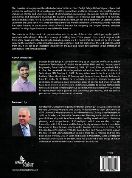 "MODERN REGIONALISM: The architecture of Sarbjit Bahga" is a monograph on the selected works of Indian architect Sarbjit Bahga. He has more than three-and-a-half decades of practical experience in designing of various types of buildings, complexes and large campuses. His completed works include an eclectic and impressive range of administrative, recreational, educational, medical, residential, commercial and agricultural buildings. His building designs are innovative and responsive to function, climate and materials. He is a staunch modernist and an ardent, yet not blind, admirer of Le Corbusier, Pierre Jeanneret and Louis Kahn. He is three-time recipient of the World Architecture Community Awards. His name has been featured in the Guinness Book of World Records for designing the "longest covered concrete corridor" in Vidya Sagar Institute of Mental Health, Amritsar. The main focus of this book is to present a few selected works of the architect which portray his prolific approach to the designs of the diverse range of building types. Of more than 200 projects he has designed, only 54 have been included in this treatise. These projects have been subdivided into seven categories i.e., Office Buildings, Recreational Buildings, Educational Buildings, Healthcare Buildings, Residential Buildings, Public Infrastructure, and Agricultural Buildings. These projects cover a vast range of scale from a tiny house and office building to sprawling campuses. Irrespective of their scale, these projects portray the accumulated design philosophy of the architect which has been elaborated in detail in the second chapter, "About the Architect". The first chapter of the book titled, "Metamorphosis of Architecture in Post-Independent India" dwells on the transition, development and transformation of modern Indian architecture since 1947. The projects included in the next seven chapters have been explained both objectively and subjectively, and well-illustrated with photographs and drawings which are uniformly drawn in a minimalist manner. The last chapter titled "Biography", is a brief description of the architect’s life, works, achievements, awards, honours, and publications. The book is authored by Supreet Singh Bahga, a Doctorate from Stanford University, USA, and Assistant Professor at Indian Institute of Technology (IIT) Delhi. Christopher Charles Benninger, a renowned American-Indian architect/planner, and allumnus of MIT, and Harvard University, USA, has written the foreword essay, "In Search of an Indian Architecture: Modern Regionalism." The book will be of immense value to the architects, urban designers, planners, engineers and the students of these disciplines. Apart from this, it will act as an important link between the past and future developments in the profession of architecture in the Indian context. Future historians will find a lot of valuable content in this compilation. It is an earnest attempt to keep the beacon of architecture glowing in the minds of the generations to come.