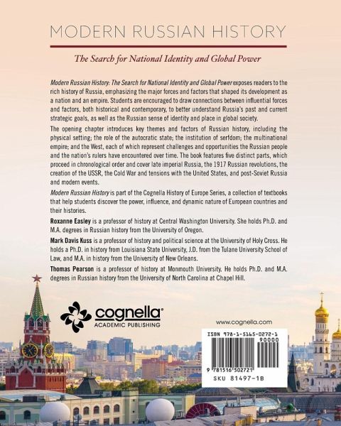 Modern Russian History: The Search for National Identity and Global Power exposes readers to the rich history of Russia, emphasizing the major forces and factors that shaped its development as a nation and an empire. Students are encouraged to draw connections between influential forces and factors, both historical and contemporary, to better understand Russia's past and current strategic goals, as well as the Russian sense of identity and place in global society. The opening chapter introduces key themes and factors of Russian history, including the physical setting; the role of the autocratic state; the institution of serfdom; the multinational empire; and the West, each of which represent challenges and opportunities the Russian people and the nation's rulers have encountered over time. The book features five distinct parts, which proceed in chronological order and cover late imperial Russia, the 1917 Russian revolutions, the creation of the USSR, the Cold War and tensions with the United States, and post-Soviet Russia and modern events. Modern Russian History is part of the Cognella History of Europe Series, a collection of textbooks that help students discover the power, influence, and dynamic nature of European countries and their histories. Roxanne Easley is a professor of history at Central Washington University. She holds Ph.D. and M.A. degrees in Russian history from the University of Oregon. Mark Davis Kuss is a professor of history and political science at the University of Holy Cross. He holds a Ph.D. in history from Louisiana State University, J.D. from the Tulane University School of Law, and M.A. in history from the University of New Orleans. Thomas Pearson is a professor of history at Monmouth University. He holds Ph.D. and M.A. degrees in Russian history from the University of North Carolina at Chapel Hill.