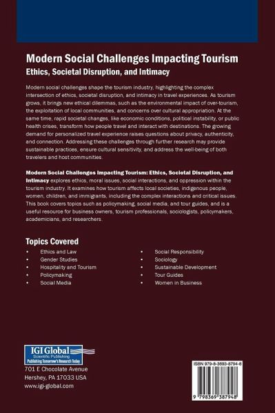 Modern social challenges shape the tourism industry, highlighting the complex intersection of ethics, societal disruption, and intimacy in travel experiences. As tourism grows, it brings new ethical dilemmas, such as the environmental impact of over-tourism, the exploitation of local communities, and concerns over cultural appropriation. At the same time, rapid societal changes, like economic conditions, political instability, or public health crises, transform how people travel and interact with destinations. The growing demand for personalized travel experience raises questions about privacy, authenticity, and connection. Addressing these challenges through further research may provide sustainable practices, ensure cultural sensitivity, and address the well-being of both travelers and host communities. Modern Social Challenges Impacting Tourism: Ethics, Societal Disruption, and Intimacy explores ethics, moral issues, social interactions, and oppression within the tourism industry. It examines how tourism affects local societies, indigenous people, women, children, and immigrants, including the complex interactions and critical issues. This book covers topics such as policymaking, social media, and tour guides, and is a useful resource for business owners, tourism professionals, sociologists, policymakers, academicians, and researchers.