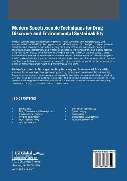 Modern spectroscopic techniques play a pivotal role in advancing both drug discovery and environmental sustainability, offering precise and efficient methods for analyzing complex molecular structures and interactions. In the field of drug discovery, techniques like nuclear magnetic resonance, mass spectrometry, and infrared spectroscopy enable researchers to identify potential drug candidates, monitor their behavior in biological systems, and optimize their safety profiles. Spectroscopic methods in environmental science are used to detect pollutants, monitor ecosystem health, and evaluate the impact of human activity on the environment. Further research into modern spectroscopic techniques may accelerate scientific discovery while supporting sustainable practices aimed at preserving human health and environmental well-being. Modern Spectroscopic Techniques for Drug Discovery and Environmental Sustainability explores the various aspects of spectroscopy in drug discovery and environmental sustainability. It examines techniques in spectroscopic technology for improving the organized efforts in dealing with drug development and sustainable practices. This book covers topics such as nutrient analysis, infrared technology, and biomarkers, and is a useful resource for environmental scientists, drug developers, biologists, academicians, and researchers.