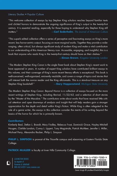 The Modern Stephen King Canon: Beyond Horror is a collection of essays focused on the more recent writings of Stephen King, including Revival, 11/22/63, and a selection of short stories by the "Master of the Macabre." The authors write about King works that have received little critical attention and aim to open up doorways of analysis and insight that will help readers gain a stronger appreciation for the depth and detail within King's fiction. Indeed, while King is often relegated to the role of a genre writer (horror), the essays in this collection consider the merits of King's writing beyond the basics of horror for which he is primarily known. Recommended for scholars of literature, horror, and popular culture.