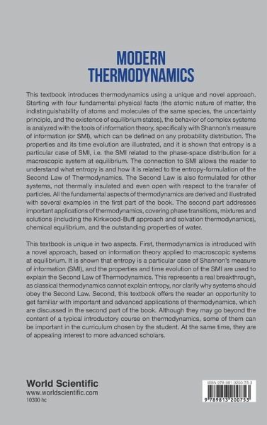 This textbook introduces thermodynamics with a modern approach, starting from four fundamental physical facts (the atomic nature of matter, the indistinguishability of atoms and molecules of the same species, the uncertainty principle, and the existence of equilibrium states) and analyzing the behavior of complex systems with the tools of information theory, in particular with Shannon's measure of information (or SMI), which can be defined on any probability distribution. SMI is defined and its properties and time evolution are illustrated, and it is shown that the entropy is a particular type of SMI, i.e. the SMI related to the phase-space distribution for a macroscopic system at equilibrium. The connection to SMI allows the reader to understand what entropy is and why isolated systems follow the Second Law of Thermodynamics. The Second Llaw is also formulated for other systems, not thermally isolated and even open with respect to the transfer of particles. All the fundamental aspects of thermodynamics are derived and illustrated with several examples in the first part of the book. The second part addresses important applications of thermodynamics, covering phase transitions, mixtures and solutions (including the Kirkwood-Buff approach and solvation thermodynamics), chemical equilibrium, and the outstanding properties of water. This textbook is unique in two aspects. First, thermodynamics is introduced with a novel approach, based on information theory applied to macroscopic systems at equilibrium. It is shown that entropy is a particular case of Shannon's measure of information (SMI), and the properties and time evolution of the SMI are used to explain the Second Law of Thermodynamics. This represents a real breakthrough, as classical thermodynamics cannot explain entropy, nor clarify why systems should obey the Second Law. Second, this textbook offers the reader the possibility to get in touch with important and advanced applications of thermodynamics, to address the topics discussed in the second part of the book. Although they may go beyond the content of a typical introductory course on thermodynamics, some of them can be important in the curriculum chosen by the student. At the same time, they are of appealing interest to more advanced scholars.