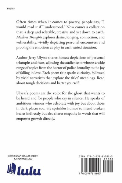 Often times when it comes to poetry, people say, "I would read it if I understood." Now comes a collection that is deep and relatable, creative and yet down to earth. Modern Thoughts explores desire, longing, connection, and vulnerability, vividly depicting personal encounters and probing the emotions at play in each varied situation. Author Jerry Ulysse shares honest depictions of personal triumphs and fears, allowing the audience to witness a wide range of topics from the horror of police brutality to the joy of falling in love. Each poem title sparks curiosity, followed by vivid narratives that explore the titles' meanings. Read about tough decisions and better yourself. Ulysse's poems are the voice for the ghost that wants to be heard and for people who cry in silence. He speaks of ambitious winners who celebrate with joy but about those in dark places too. He sprinkles humor to mend broken hearts indirectly but also shares empathy in words that will empower growth directly.