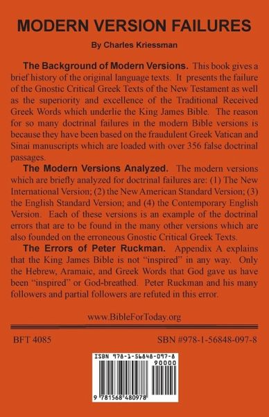 This book gives a brief history of the original language texts. It presents the failure of the Gnostic Critical Greek Texts of the New Testament as well as the superiority and excellence of the Traditional Received Greek Words which underlie the King James Bible. The reason for so many doctrinal failures in the modern Bible versions is because they have been based on the fraudulent Greek Vatican and Sinai manuscripts which are loaded with over 356 false doctrinal passages. The New International Version, the New American Standard Version, The English Standard Version and the Contemporary English Version are used to demonstrate the doctrinal failures of modern versions. Peter Ruckman's false textual position on inspiration is refuted.