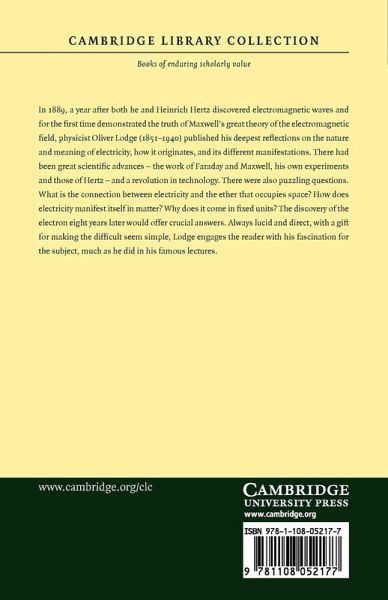 In 1889, a year after both he and Heinrich Hertz discovered electromagnetic waves and for the first time demonstrated the truth of Maxwell's great theory of the electromagnetic field, physicist Oliver Lodge (1851-1940) published his deepest reflections on the nature and meaning of electricity, how it originates, and its different manifestations. There had been great scientific advances - the work of Faraday and Maxwell, his own experiments and those of Hertz - and a revolution in technology. There were also puzzling questions. What is the connection between electricity and the ether that occupies space? How does electricity manifest itself in matter? Why does it come in fixed units? The discovery of the electron eight years later would offer crucial answers. Always lucid and direct, with a gift for making the difficult seem simple, Lodge engages the reader with his fascination for the subject, much as he did in his famous lectures.