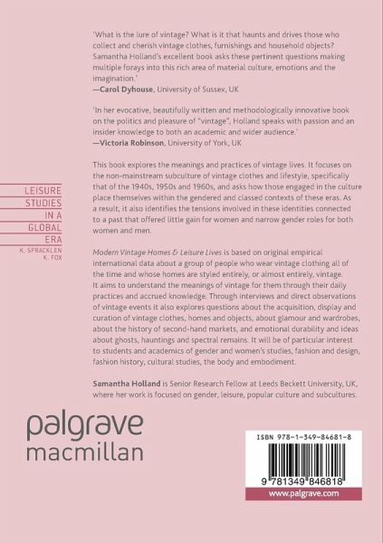 Modern Vintage Homes & Leisure Lives is based on original empirical international data about a group of people who wear vintage clothing all of the time and whose homes are styled entirely, or almost entirely, vintage. It aims to understand the meanings of vintage for them through their daily practices and accrued knowledge. Through interviews and direct observations of vintage events it also explores questions about the acquisition, display and curation of vintage clothes, homes and objects, about glamour and wardrobes, about the history of second-hand markets, and emotional durability and ideas about ghosts, hauntings and spectral remains. It will be of particular interest to students and academics of gender and women's studies, fashion and design, fashion history, cultural studies, the body and embodiment.