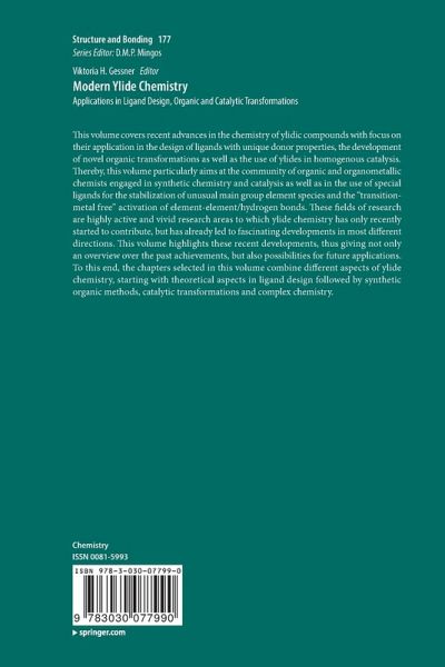 This volume covers recent advances in the chemistry of ylidic compounds with focus on their application in the design of ligands with unique donor properties, the development of novel organic transformations as well as the use of ylides in homogenous catalysis. Thereby, this volume particularly aims at the community of organic and organometallic chemists engaged in synthetic chemistry and catalysis as well as in the use of special ligands for the stabilization of unusual main group element species and the "transition-metal free" activation of element-element/hydrogen bonds. These fields of research are highly active and vivid research areas to which ylide chemistry has only recently started to contribute, but has already led to fascinating developments in most different directions. This volume highlights these recent developments, thus giving not only an overview over the past achievements, but also possibilities for future applications. To this end, the chapters selected in thisvolume combine different aspects of ylide chemistry, starting with theoretical aspects in ligand design followed by synthetic organic methods, catalytic transformations and complex chemistry.