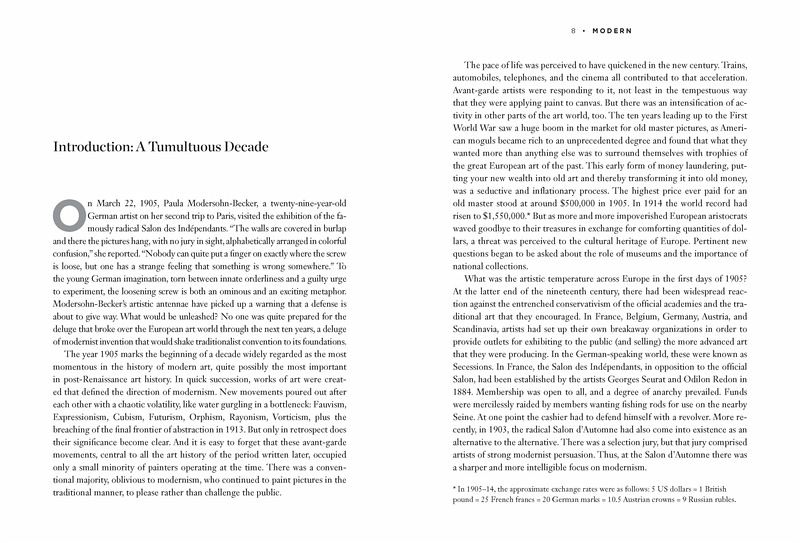 Modern begins on a specific day-March 22, 1905-at a specific place: the Salon des Indépendants in Paris, where works of art we recognize as modern were first exhibited. Drawing on his forty five-year fine art career, author Philip Hook illuminates how this new art came to be-and how truly shocking it was. With Hook's expert guidance, we witness movement upon movement that burst forth in dizzying succession: Fauvism, Expressionism, Primitivism, Symbolism, Cubism, Futurism, and Abstract art. As Hook barnstorms across Europe-to London, Germany, Moscow, Scandinavia, and everywhere modern art was being made-his vivid accounts breathe new life into the work and times of Picasso, Matisse, Modigliani, Kandinsky, Malevich, Klimt, Schiele, Munch, and nearly two hundred other artists who painted, sculpted, and exhibited alongside them, and whose collective genius was understood and appreciated by few at the time. Hook reconsiders the decade from a series of fresh angles: What was the conventional art against which Modernism sought to rebel? Why were avant-garde artists so self-obsessed? What persuaded a few bold collectors to buy difficult modern art? And why did others pay so much money for Old Masters at the same time? Modern helps us answer these questions and more-and to see how avant-garde artists marshaled their genius (and oftentimes their madness) to create works of such profound consequence, they still reverberate today-and which, taken together, made for a movement more influential than even the Renaissance.