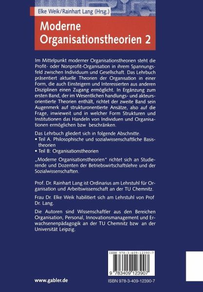 Im Mittelpunkt moderner Organisationstheorien steht die Profit- oder Nonprofit-Organisation in ihrem Spannungsfeld zwischen Individuum und Gesellschaft. Das Lehrbuch präsentiert aktuelle Theorien der Organisation in einer Form, die auch Einsteigern und Interessierten aus anderen Disziplinen einen Zugang ermöglicht. In Ergänzung zum ersten Band, der im wesentlichen handlungs- und akteursorientierte Theorien enthält, richtet der zweite Band sein Augenmerk auf strukturorientierte Ansätze, also auf die Frage, inwieweit und in welcher Form Strukturen und Institutionen das Handeln von Individuen und Organisationen ermöglichen bzw. beschränken.