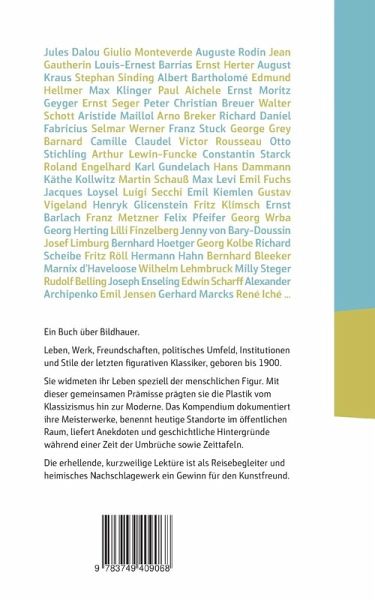 Ein Buch über Bildhauer. Leben, Werk, Freundschaften, politisches Umfeld, Institutionen und Stile der letzten figurativen Klassiker, geboren bis 1900. Sie widmeten ihr Leben speziell der menschlichen Figur. Mit dieser gemeinsamen Prämisse prägten sie die Plastik vom Klassizismus hin zur Moderne.Das Kompendium dokumentiert ihre Meisterwerke, benennt heutige Standorte im öffentlichen Raum, liefert Anekdoten und geschichtliche Hintergründe während einer Zeit der Umbrüche sowie Zeittafeln.Die erhellende, kurzweilige Lektüre ist als Reisebegleiter und heimisches Nachschlagewerk ein Gewinn für den Kunstfreund.Jules Dalou · Giulio Monteverde · Auguste Rodin · Jean Gautherin · Louis-Ernest Barrias · Ernst Herter · August Kraus · Stephan Sinding · Albert Bartholomé · Edmund Hellmer · Max Klinger · Paul Aichele · Ernst Moritz Geyger · Ernst Seger · Peter Christian Breuer · Walter Schott · Aristide Maillol · Arno Breker · Richard Daniel Fabricius · Selmar Werner · Franz Stuck · George Grey Barnard · Camille Claudel · Victor Rousseau · Otto Stichling · Arthur Lewin-Funcke · Constantin Starck · Roland Engelhard · Karl Gundelach · Hans Dammann · Käthe Kollwitz · Martin Schauß · Max Levi · Emil Fuchs · Jacques Loysel · Luigi Secchi · Emil Kiemlen · Gustav Vigeland · Henryk Glicenstein · Fritz Klimsch · Ernst Barlach · Franz Metzner · Felix Pfeifer · Georg Wrba · Georg Herting · Lilli Finzelberg · Jenny von Bary-Doussin · Josef Limburg · Bernhard Hoetger · Georg Kolbe · Richard Scheibe · Fritz Röll · Hermann Hahn · Bernhard Bleeker · Marnix d´Haveloose · Wilhelm Lehmbruck · Milly Steger · Rudolf Belling · Joseph Enseling · Edwin Scharff · Alexander Archipenko · Emil Jensen · Gerhard Marcks · René Iché