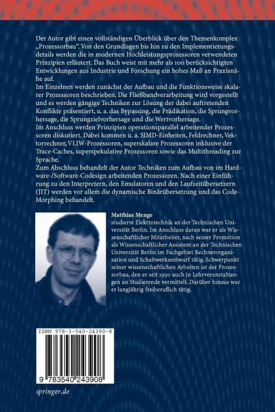 Das Buch behandelt die in modernen Hochleistungsprozessoren zum Einsatz kommenden Techniken. Nach einer einführenden Beschreibung von Programmiermodellen werden zunächst skalare Prozessoren, die Mikroprogrammierung und die Fließbandverarbeitung diskutiert.