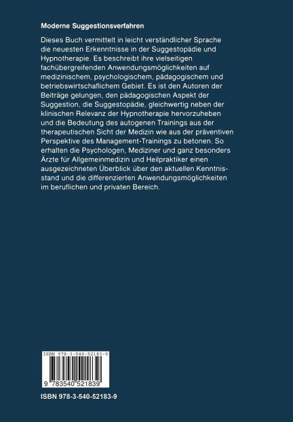 Dieses Buch vermittelt in leicht verst{ndlicher Sprache die neuesten Erkenntnisse in der Suggestop{die und Hypnothera- pie. Es beschreibt ihre vielseitigen fach}bergreifenden An- wendungsm glichkeiten auf medizinischem,psychologischem, p{dagogischem und betriebswirtschaftlichem Gebiet.