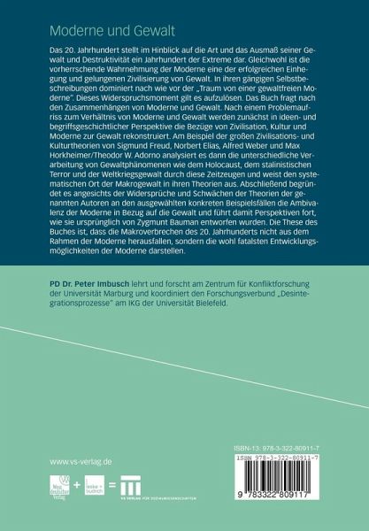 Das Buch fragt nach den Zusammenhängen von Moderne und Gewalt. In ideen- und begriffsgeschichtlicher Perspektive werden zunächst die Bezüge von Zivilisation, Kultur und Moderne zur Gewalt rekonstruiert. Am Beispiel der großen Zivilisations- und Kulturtheorien von Sigmund Freud, Norbert Elias, Alfred Weber, Max Horkheimer / Theodor W. Adorno analysiert es die unterschiedliche Verarbeitung von Gewaltphänomenen wie den Holocaust, den stalinistischen Terror und die Weltkriegsgewalt durch diese Zeitzeugen und weist den systematischen Ort der Makrogewalt in ihren Theorien aus. Abschließend begründet es angesichts der Widersprüche und Schwächen der Theorien die Ambivalenz der Moderne in Bezug auf die Gewalt, wie sie ursprünglich von Zygmunt Bauman entworfen wurde.