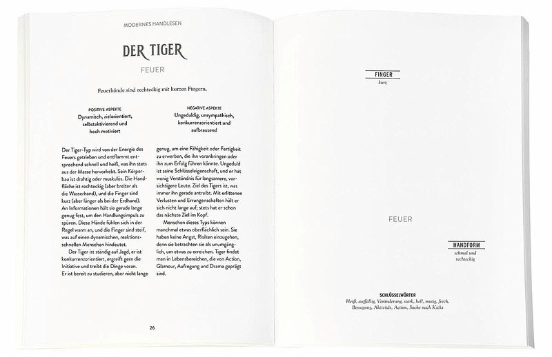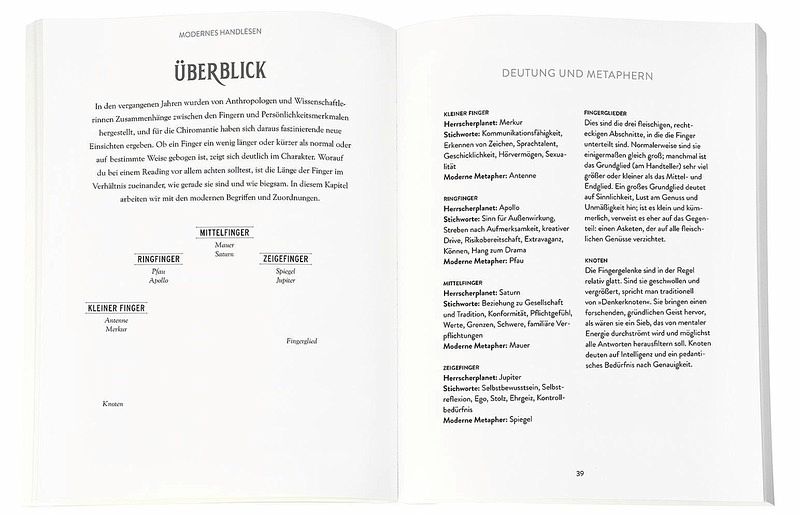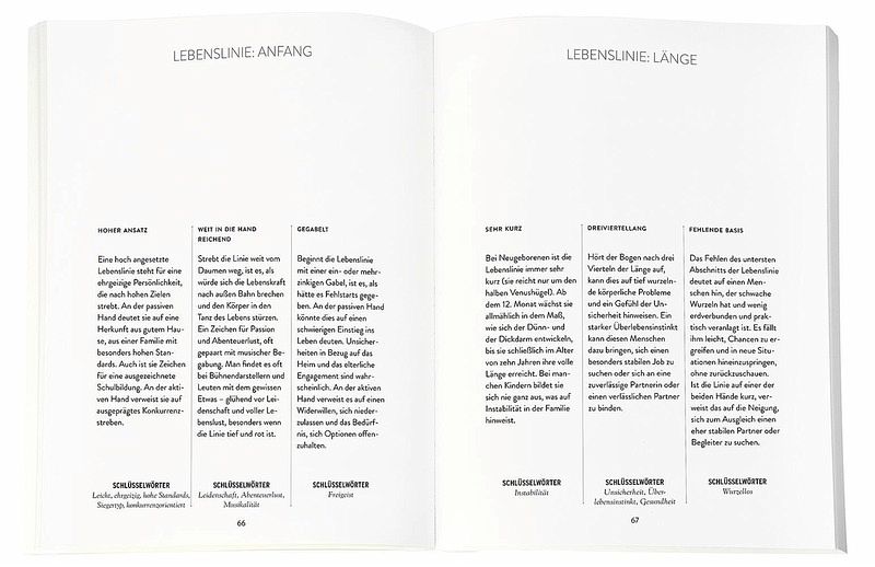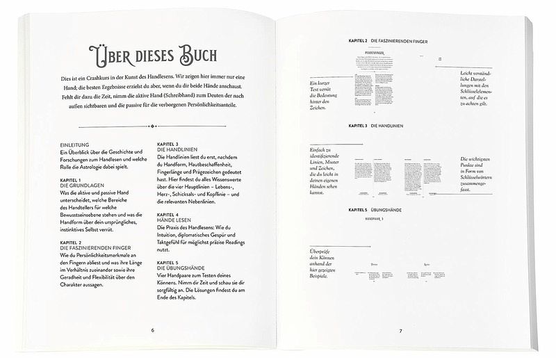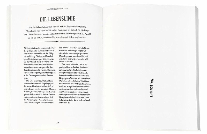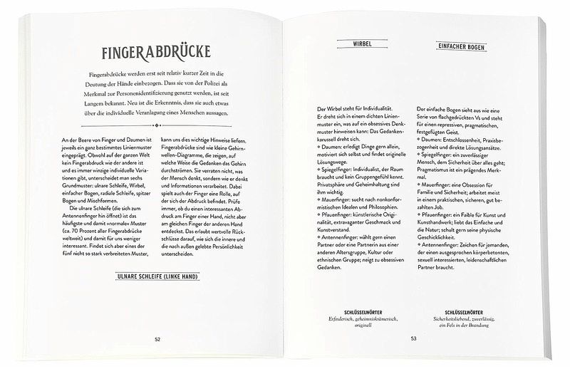 Zunächst werden die Grundlagen wie aktive und passive Hand, die Rolle unterschiedlicher Handformen und die Länge der einzelnen Finger vermittelt. Wir erfahren außerdem, welche Bedeutung Herzlinie, Lebenslinie und Schicksalslinie sowie andere Muster auf der Handfläche haben und was sie uns über Persönlichkeitsmerkmale, charakterliche Besonderheiten und Entwicklungspotenziale verraten. Auch die Interpretation der Nebenlinien wird erklärt, ebenso wie die Papillarlinien und sogar die Fingerabdrücke, die erst seit relativ kurzer Zeit in die Deutung der Hände einbezogen werden.